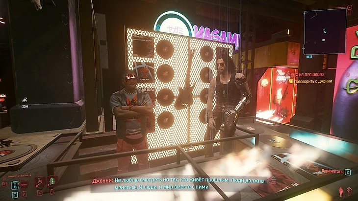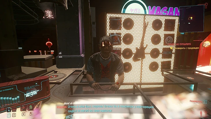 Поговорите с дедулей. Он сомневается, что такой молодой парень/девушка, как Ви, может помнить что-то о «Самурае» – можете попросить у Джонни помощь, и он повредничает, но согласится. Или выберите вариант, отмеченный 7 Хладнокровия в диалоге, чтобы побыстрее попасть в меню покупок. Возьмите там отмеченную значком запись, а также можете закупиться фанатскими штуками – они дорогие, но больше у вас не будет возможности купить такое снаряжение, это единственная возможность в игре.