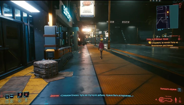 Вам нужно дождаться, пока она выйдет, и пройти за ней, держась на расстоянии 15-20 метров, чтобы не провалить квест. Джонни все это время будет закадровым голосом, описывающим детектив – в английской версии игры название квеста отсылает к Рэймонду Чандлеру, известному автору детективов «Вечный сон», «Прощай, любимая» и других.