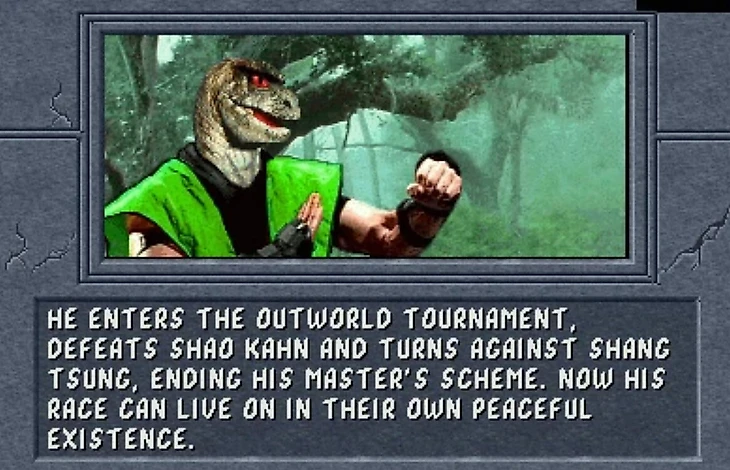 Кстати, концовка бойца в MK II неправильная. И дело даже не в том, что по канону турнир выигрывает Лю Кан, а в том, что после победы бойца над Шао Каном, каким-то чудом оказывается жива раса Рептилии, чего он и добивается в каждой части.