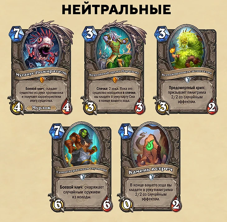 Интересная нейтральная карта – Мутантус Пожиратель, которая съедает существо из руки соперника и получает его характеристики. Она стоит 7 маны, поэтому ее можно включать в колоду, только если вы планируете доживать до 7 хода. Съеденный Билетикус – это круто!