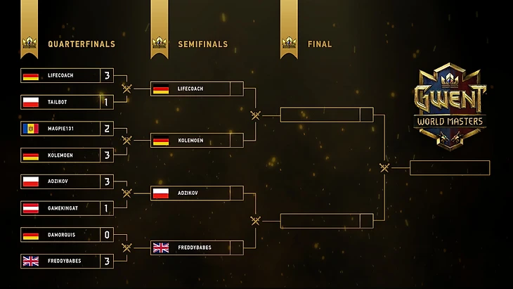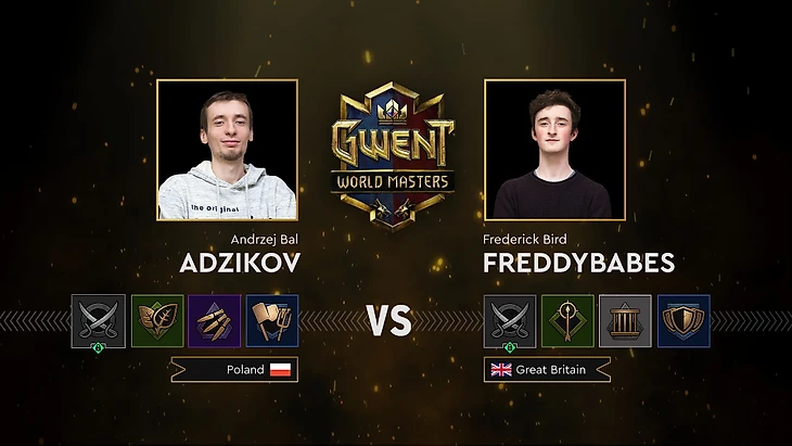 В решающей партии у гвинтеров остались колоды Королевств Севера с Радеей и Скоя'таэлей на спеллах и усилении дриад. Казалось, Freddybabes выигрывает первый раунд из-за Цири, дающей карту, но Adzikov не останавливается и по ходу раунда успевает поменяться ролью ходящего первым с оппонентом. Поляк выигрывает раунд и оставляет в руке разбаффанного Гезраса из Лейды. Оба игрока имеют отличные карты и Adzikov принимает решение пушить. Freddybabes удается выиграть карту, а в третьем раунде все становится понятно уже на этапе муллигана. Британец выходит в финал! (3:2)