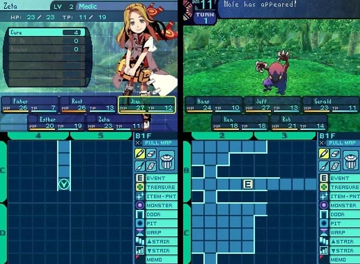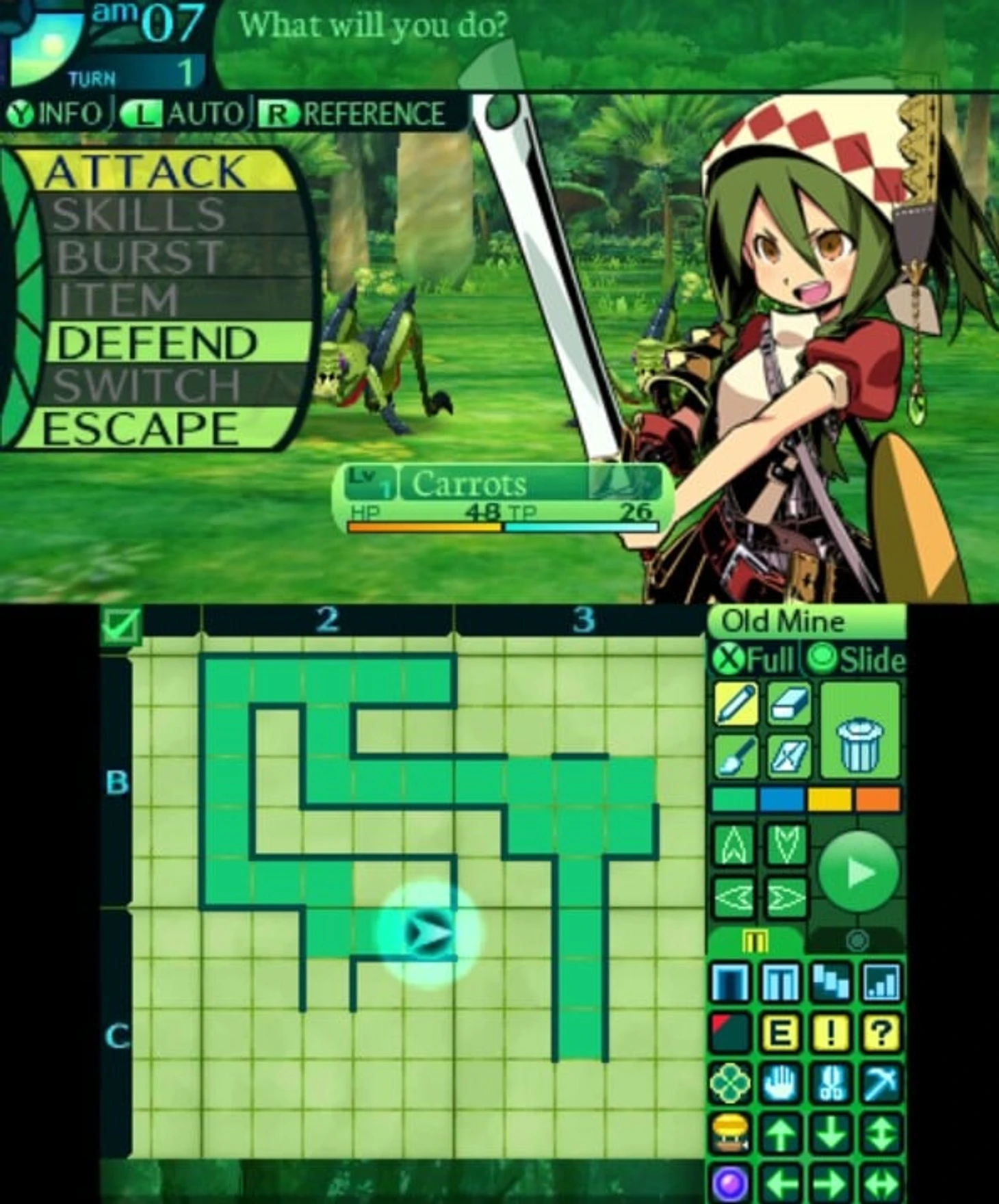 В Etrian Odyssey на тачскрине показана карта, сменить ее можно только на экран меню. И если в других играх карта открыта изначально и заполняется деталями сама при передвижении персонажа, то в EO все увиденное фиксировать надо самому. Схематично, конечно: персонаж ходит по клеткам, поэтому карта тоже представляет из себя набор клеток. Единственное, что делает игра – рисует ландшафт, на котором стоит персонаж, но ни препятствий или тупиков, ни точек сохранений и других точек интереса на ней не появится, пока это не сделает игрок.