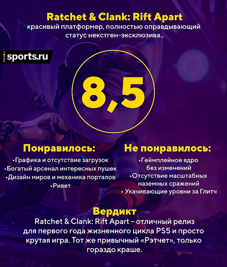 Ratchet & Clank: Rift Apart – замечательный экшен-платформер, которому недостает инновационности, чтобы стать по-настоящему великим. Разработчики хорошо вплели идею с межпространственными разломами в геймплей и сюжет, но оставили все остальное практически таким же, как и раньше. Кого-то это наверняка расстроит – мне же просто радостно, что серия, кажется, окончательно вернулась в строй.