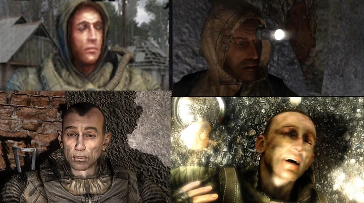 Во всех кат-сценах «Сталкера» Стрелок выглядит одинаково – одет в зеленоватый костюм и шлем, рюкзак он не носит. Сделано это, скорее всего, для узнаваемости персонажа, но есть одна не состыковка – просто посмотрите на то, как менялся персонаж.