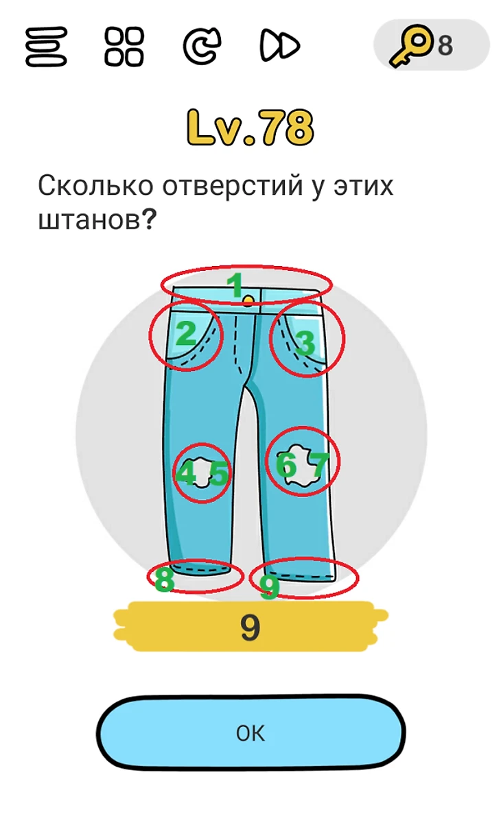 84. Сколько отверстий у этих штанов? 1 верхнее, 2 снизу, 2 кармана, 2 дырки спереди, 2 дырки сзади. Всего 9.