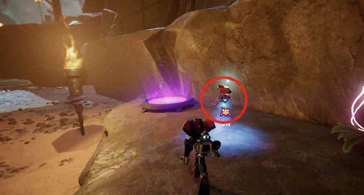 Этот робошпион Ratchet & Clank: Rift Apart спрятан в северо-восточной части карты, внутри пещеры с заброшенным пиратским кораблем. Вход в пещеру находится на юге от иконки робошпиона: в зоне с водопадами нужно прыгнуть по двум каменным платформам, чтобы попасть внутрь. Ориентир входа – большой кристалл раритариума.