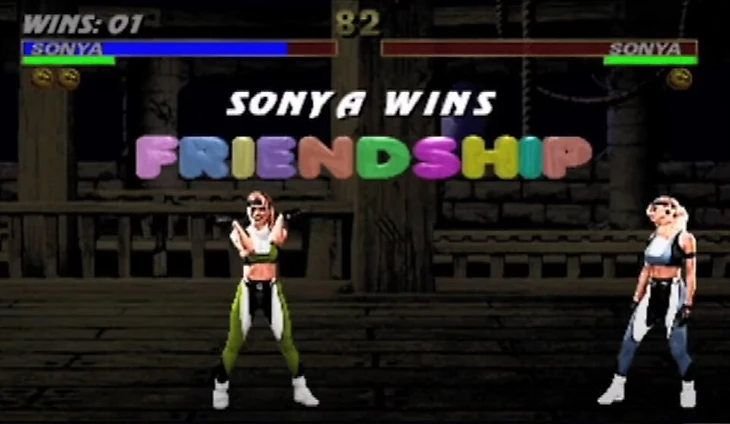 Почему-то больше всего в MK3 пострадали необычные добивания. Шиве наспех сделали animality Скорпиона, а вот Соне будто не стали придумывать friendship. Выглядит оно так, будто авторы сказали Керри Хоскинс, исполнившей роль Сони «сделай что-то забавное. Что хочешь». Ну а она просто начала махать руками.