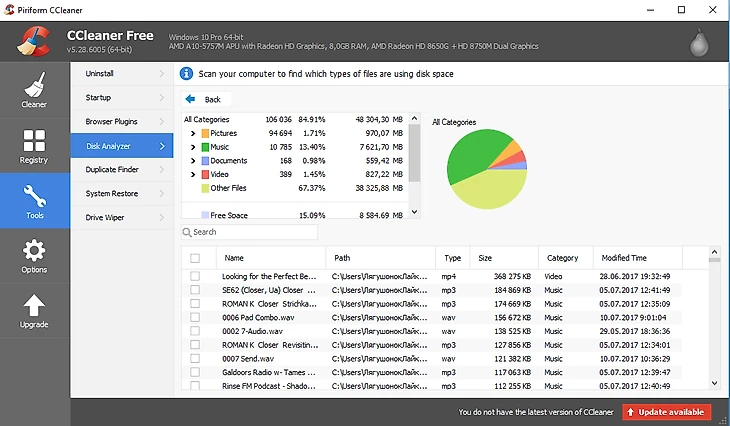 Когда-то давно вы скачали Blu-ray IMAX Edition третьего «Гарри Поттера», который весит 10 ГБ, но не пересматривали его уже несколько лет. Или 168 альбомов Сони Мармеладовой. Или видео с отдыха на Кипре весом в 3 ГБ. Проблема больших и ненужных файлов в том, что они и большие, не нужны, но занимают очень много места. Найти такие файлы можно с помощью того же CCleaner (раздел Tools, затем Disc Analyzer).