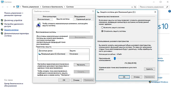Не самый безопасный вариант, но тем не менее. Порой средства восстановления Виндовс могут занимать до 15 ГБ, что для маленьких SSD-шников ощутимо. Количество точек восстановления можно уменьшить. Для этого заходим в «Мой/Этот компьютер, нажимаем на «Свойства компьютера». Находим «Защиту Системы», выбираем «Настроить» и двигаем шкалу в сторону желаемого для нас объема. Только не нужно двигать шкалу в ноль. Если у вас большой SSD-диск, то этот пункт можно смело пропускать.