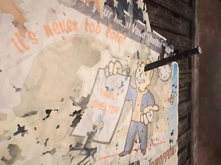 Внутри убежища лишь один житель, ставший скелетом. Напротив него – плакат «Волт-тек» с ножом, воткнутым в голову Волт-боя. Причин такой ненависти может быть несколько, но я выделю две. Первая – перед нами бывший сотрудник компании, знающий о происходящем в их убежищах (напомню – там проводят эксперименты над людьми). Вторая – этот несчастный просто не получил свое убежище от «Волт-тек», и пришлось копать свое, ставшее могилой.