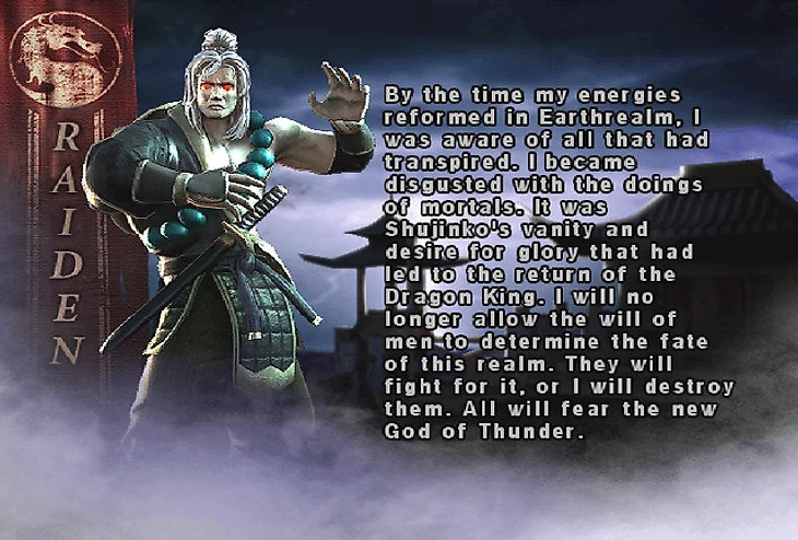 Объяснение его возвращения выглядит как-то так: «Райдэн должен был возродиться на Земле без воспоминаний о произошедшем, но по не ясным причинам, он возродился со всеми воспоминаниями и новым характером». В новом облике бог грома перестал быть добряком и решил стать тираном – подчинить Земное царство, а не быть его защитником.