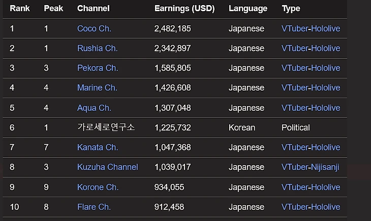 По подсчетам Playboard, за карьеру на ютубе Коко получила донатов на 2,4 млн долларов. Это, кстати, лучший показатель в истории Ютуба. А чтобы оценить общую популярность жанра, просто взгляните на эти топ-10, где есть место только витьюберам и корейскому политическому комментатору.