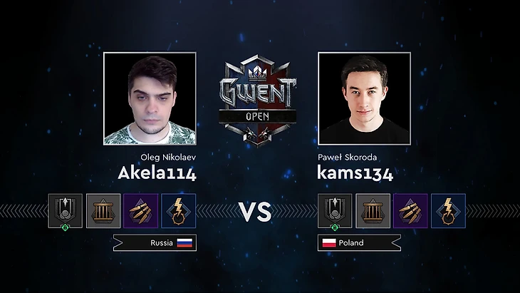 Игрок из России открывал матч. Он взял колоду Севера на Синих полосках, kams134 предпочел Скеллиге с Мадуком. Akela114 выиграл первый раунд, после чего быстро ушел в третий. В последнем полном раунде Akela114 разыгрывает свой партизанский отряд на 41 очко за ход, но этого ему не хватает. (0:1)