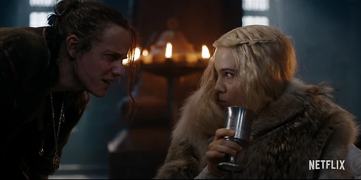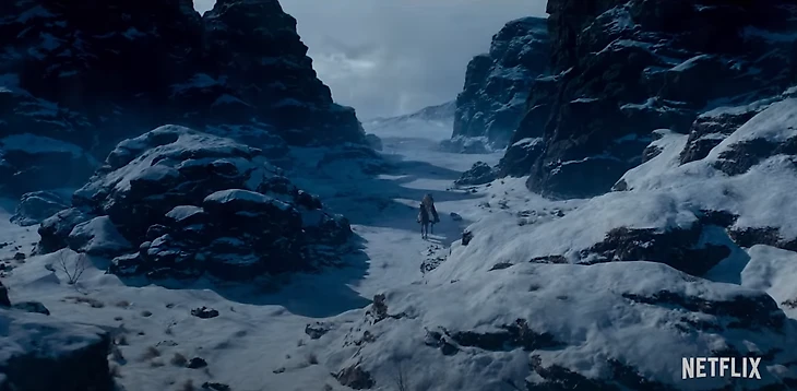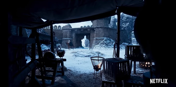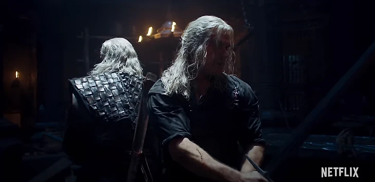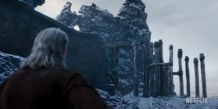 Геральт тренируется, пока Весемир смотрит на него снизу. Наставника показали дважды со спины – хоть и были слухи о том, что его может сыграть Марк Хэмилл, эту роль все-таки исполнил Ким Бодния.