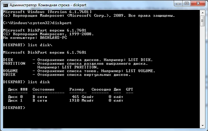 1. DISKPART>list disk (список подключенных накопителей, нам нужна наша подготовленная минимум на 8 ГБ флешка)