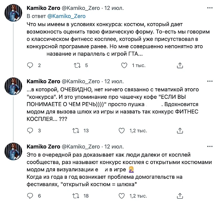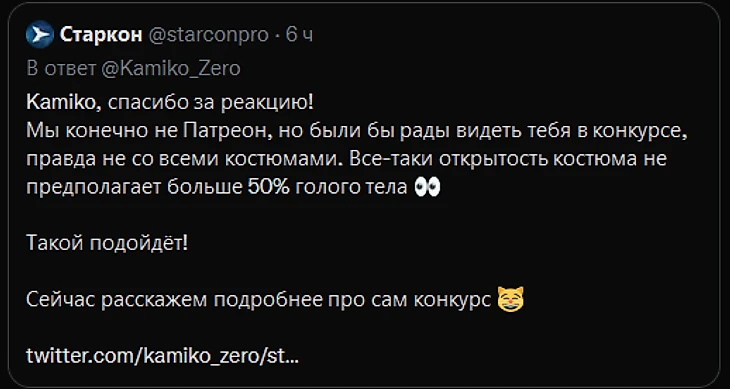 Представитель фестиваля ответил Kamiko Zero с официального аккаунта «Старкона», упомянув Patreon девушки – там косплеер выкладывает, в том числе, «более приватные фотографии». Позже твит удалили.
