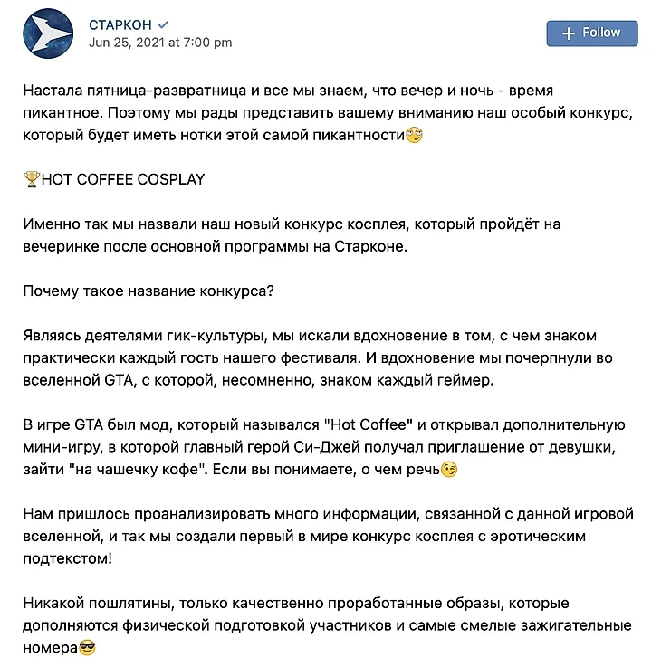 Скандальной оказалась сама формулировка нового конкурса. В сообщении официального сообщества (на момент публикации статьи – все еще не удалено) использовано несколько фраз с сексуальным подтекстом: «пятница-развратница», «первый в мире конкурс косплея с эротическим подтекстом».
