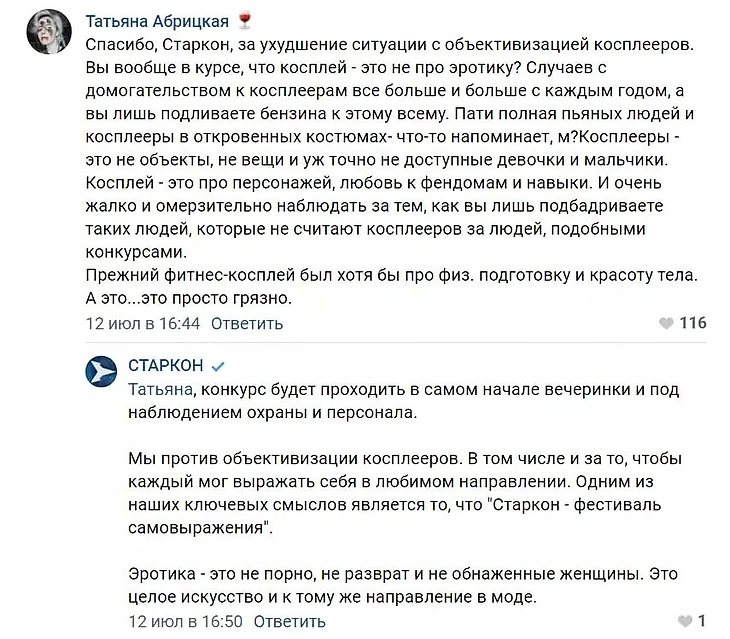 Как говорится, рыба гниет с головы. Простые СММ-щики не могли бы вести себя так, как они ведут себя сейчас, без полного одобрения руководства. Что бы они сейчас ни сделали – лично я не готова пойти на фестиваль, на котором есть риск быть облапанной в любом моем костюме, потому что организаторы поощряют шутки с эротическим подтекстом, а мужская аудитория в комментариях прямым текстом пишет, что не может себя контролировать».