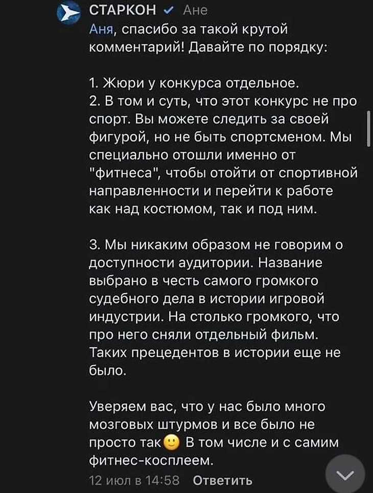В ответ на обвинения в излишней сексуализации конкурса и предложения оставить прежний конкурс фитнес-косплея «Старкон» объяснил изменения: они произошли после «мозговых штурмов» и «не просто так»: