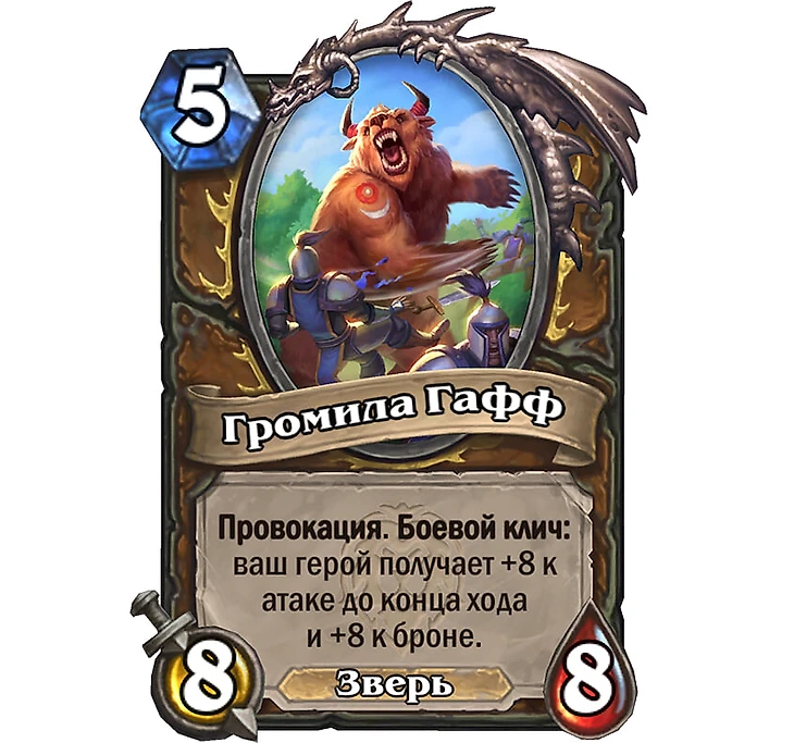 В награду вы получите Громилу Гаффа – это провокация 8/8 за 5 маны, дающая 8 брони и 8 атаки при разыгрывании.