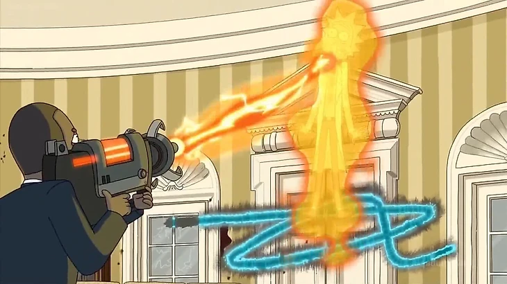 Гравитационная пушка Гордона Фримана тоже засветилась в этой же серии. Это секретное оружие, которое президент США хранит в овальном кабинете и использует в бою против Рика, когда он узнает, что Рик обманул его и резался в “Майнкрафт” вместо помощи государству.