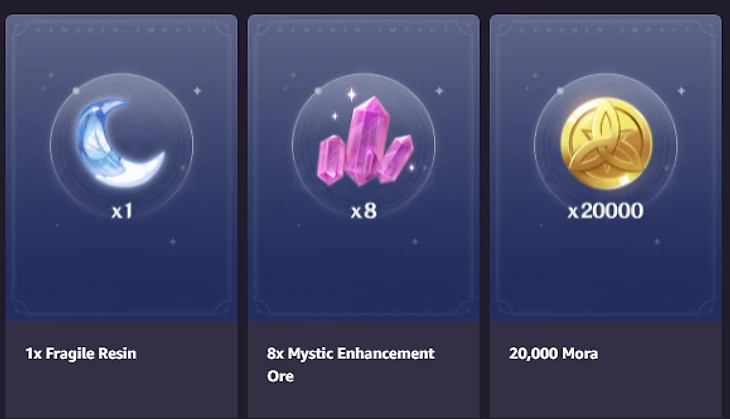 Перейдите на официальный сайт Genshin Impact для получения наград – https://gaming.amazon.com/loot/genshinimpact