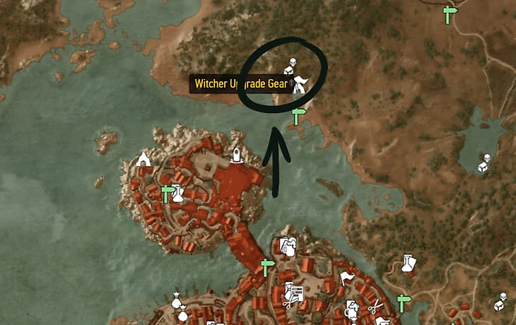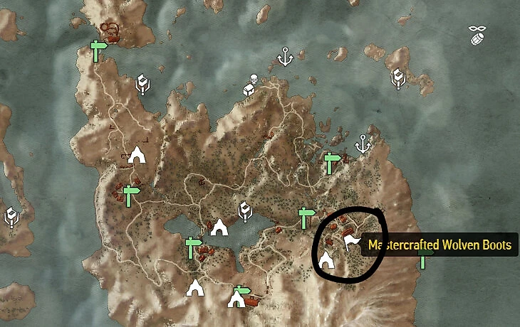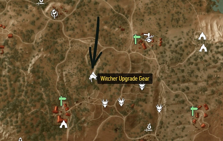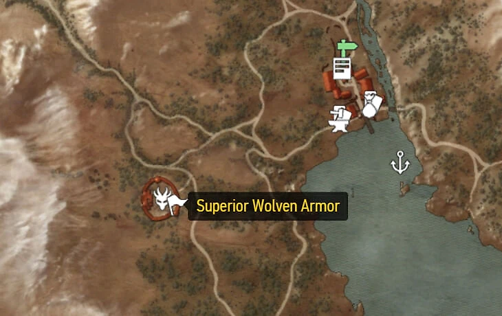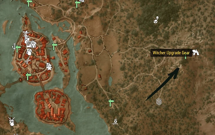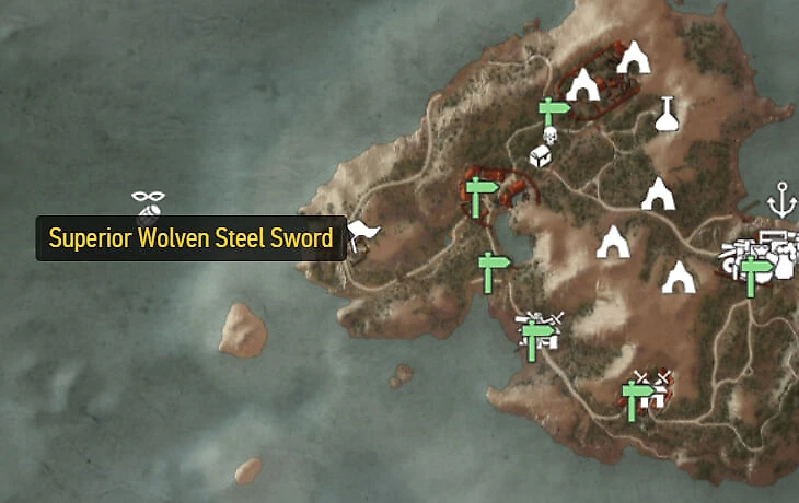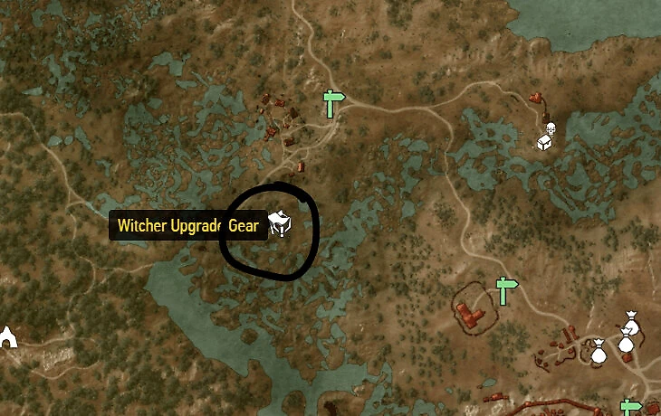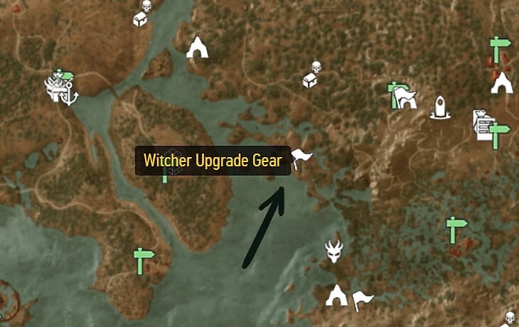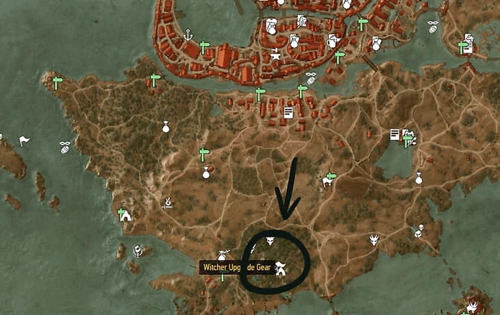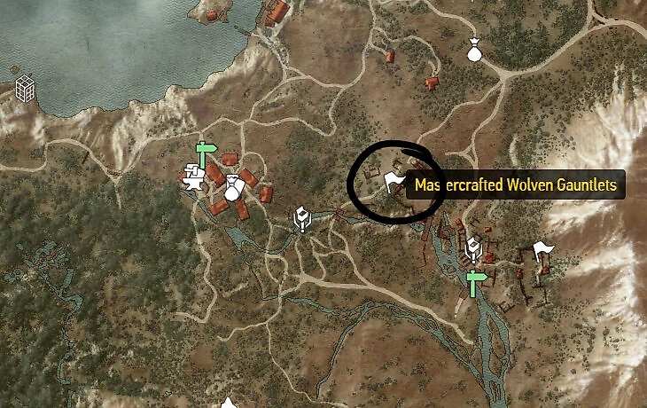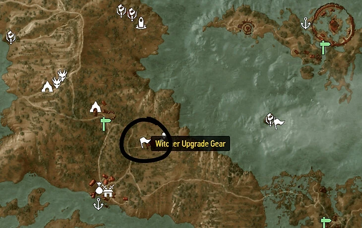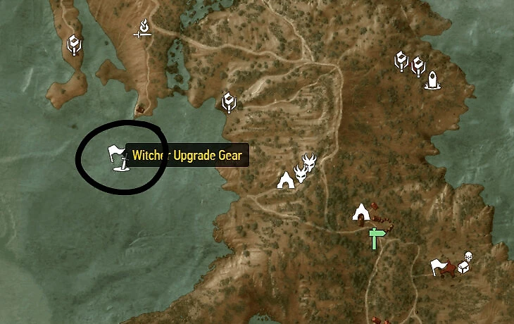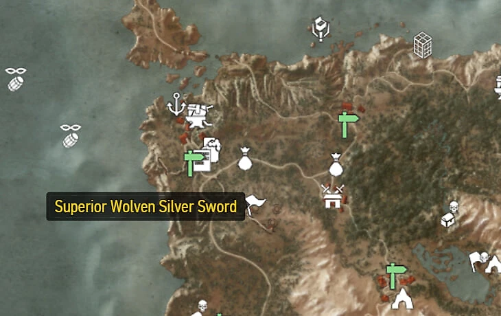 На карте отмечены два элемента мастерского снаряжения. Левый – это чертеж мастерского серебряного меча школы Кота. К нему можно дойти от деревни Харвикен (левый знак быстрого перемещения). Зайдите в пещеру и осмотрите стены на прочность с помощью ведьмачьего чутья. Разбейте Аардом слабую стену и пройдите в образованную дыру. В конце вы увидите сундуки, в одном из них лежит чертеж меча.