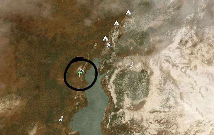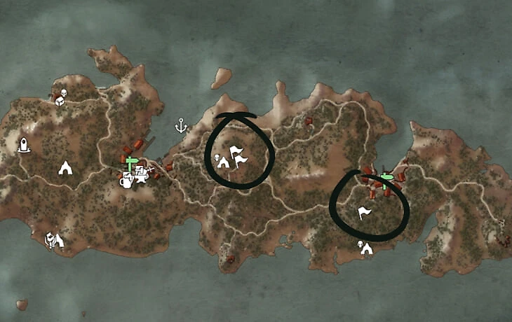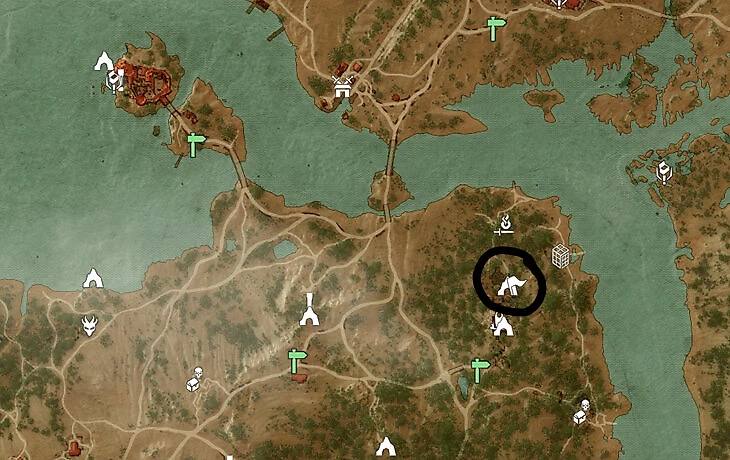 На самом юго-востоке карты расположен лагерь Нильфгаарда. Вокруг него – болота, по которым придется полазить в поисках сокровищ. От знаков быстрого перемещения «Тракт Кимбольта» (верхний на картинке) или «Гостиный дом» (нижний) вы сможете быстро добраться до места с сундуком. Его охраняет еще один бес, поэтому подготовьтесь к битве заранее.