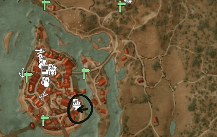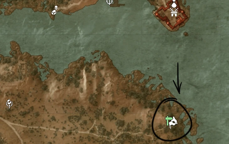 На западе от деревни Стежки (или на юге от Дуэн Хэн) нужно запрыгнуть в воду и проплыть до значка с бандитскими сокровищами. Нужно нырнуть и включить ведьмачье чутье, чтобы найти сундук с чертежом на затонувшем корабле.