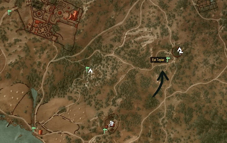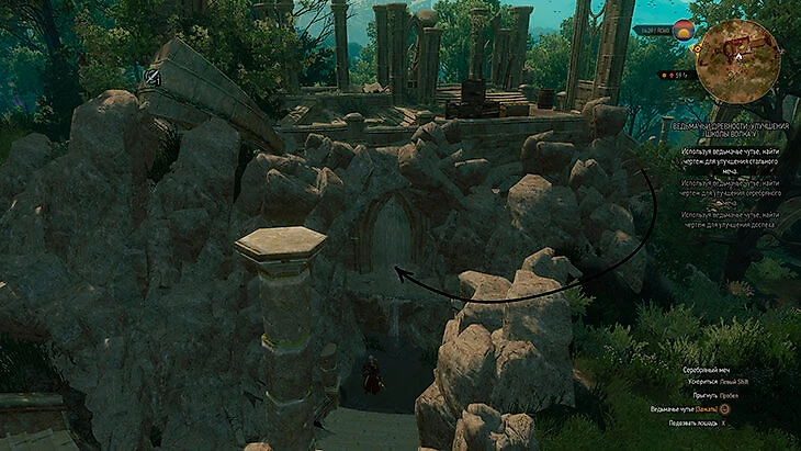 Ближайшая точка быстрого перемещения (справа на картинке) – руины дворца Термес. В лагере вы найдете записки исследователей, которые приведут вас обратно к руинам. Спускайтесь в самый низ и найдите фиолетовый рубин (снаружи от входа), который нужно поместить в рамку. После этого поставьте его на подставку справа от барьера, и барьер спадет. Внутри живут собаки-призраки баргесты. Поверните налево и разбейте слабую стену Аардом. Там поджидает сколопендроморф, убейте его и поднимайтесь к еще одной слабой стене. За ней будут призраки и баргесты, после боя подсветите комнаты ведьмачьим чутьем и найдите останки ведьмака. На его теле лежат чертежи мечей и перчаток. Продолжайте обследовать комнаты с ведьмачьим чутьем, пока не увидите на полу сумку – в ней лежат оставшиеся три чертежа.