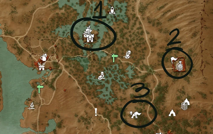 Под цифрой 1 находится крупная бандитская ганза и их босс Антуан Страгген. Без сражения никак не получить чертежи штанов и сапог.