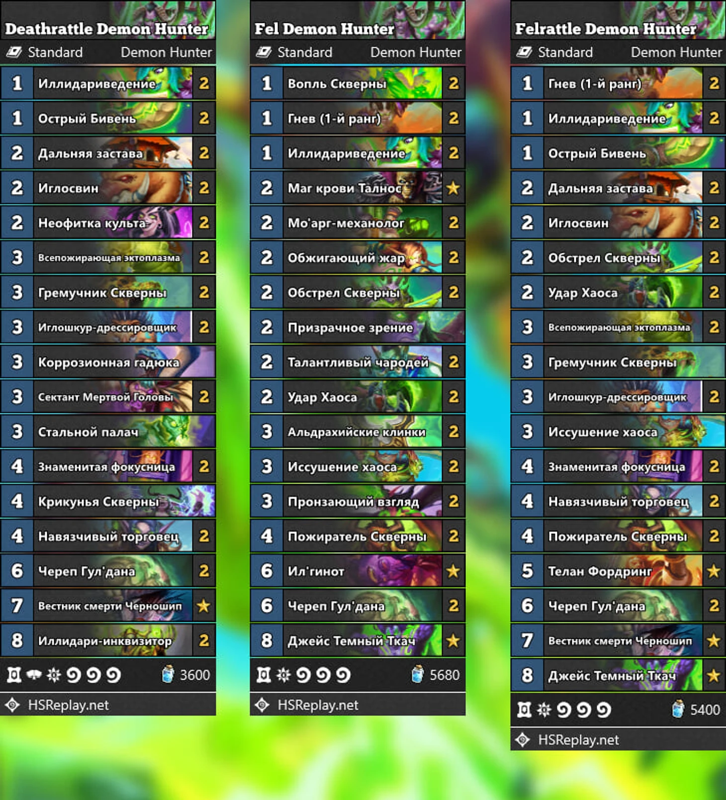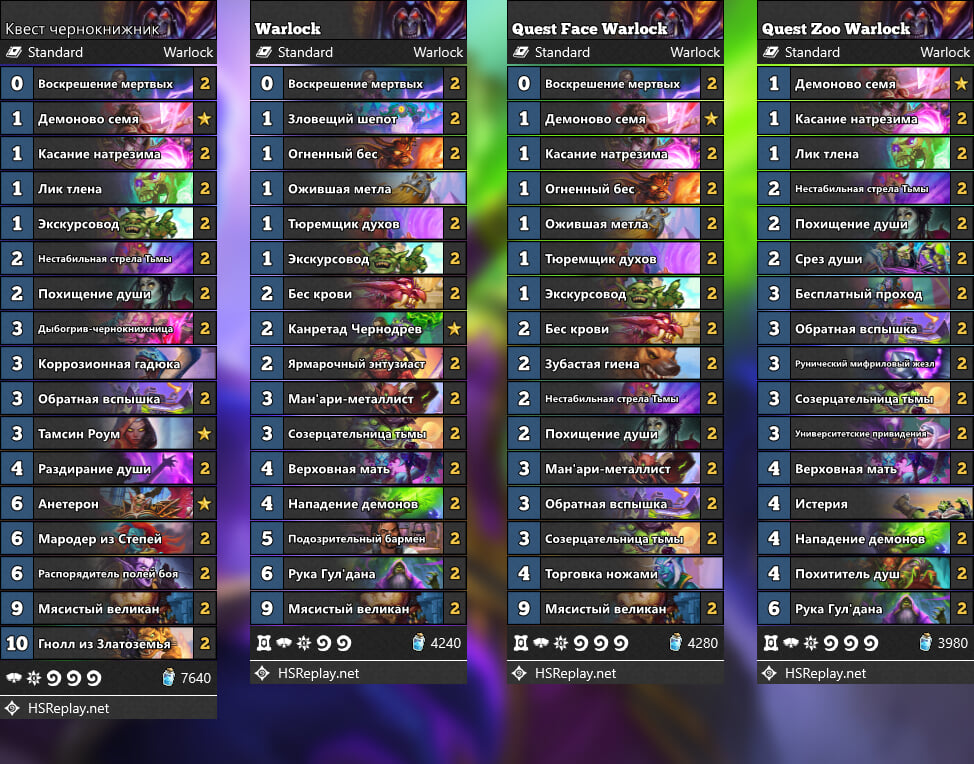 Как и маг, чернокнижник с первых дней пользуется огромной популярностью благодаря своему квесту. У него целых три вариации – фейс, зулок и хэндлок с Анетероном для тех, кому не повезло открыть его в ленте наград. Хэндлок плох только против квестовых магов, паладинов и разбойников с ядом. У более агрессивных версий проблемы с паладинами, шаманами и другими аггро-колодами, потому что за это время все научились их контрить. Зато обычный зулок без квеста хорош против шаманов и всех остальных чернокнижников.
