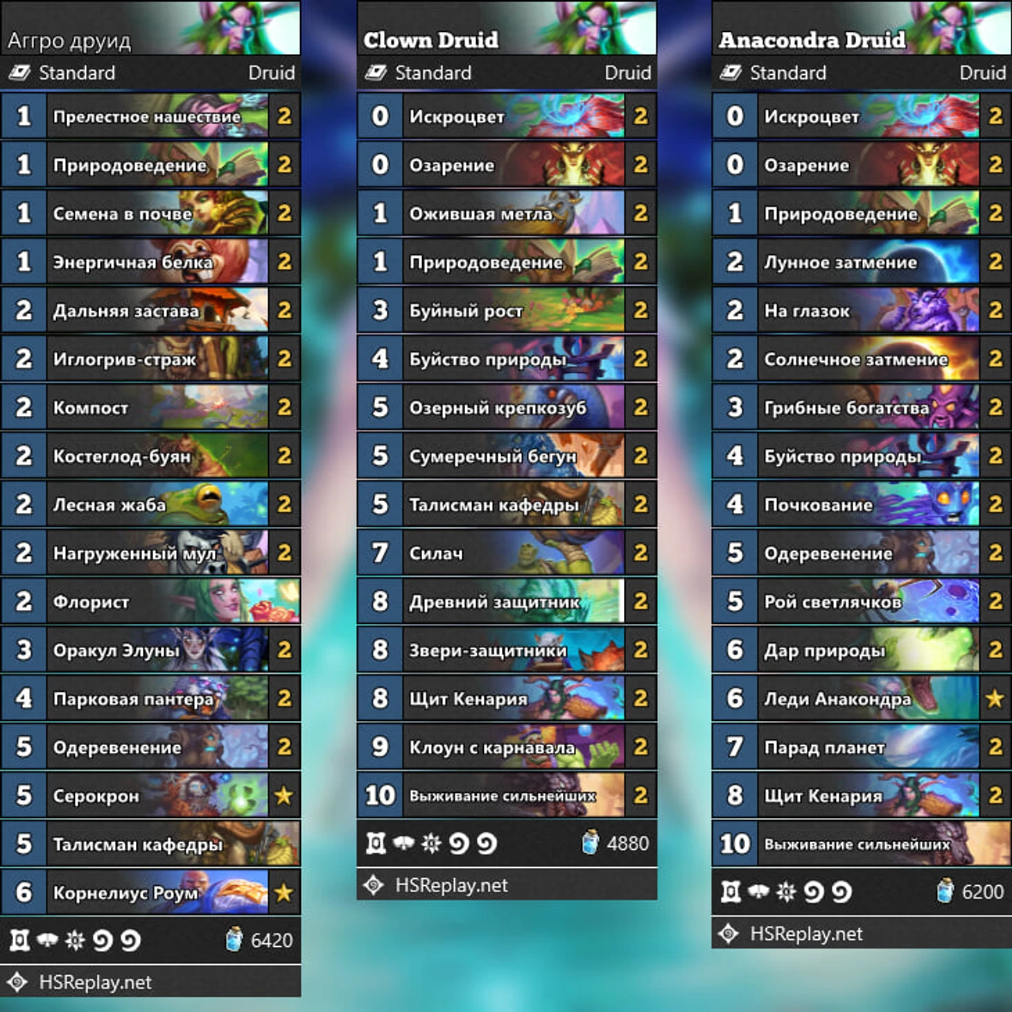 Агродруид вернулся и расцвел после нерфа «Бормотуна» с дешевыми (и удешевленными) провокациями. Он прекрасно справляется с большинством метовых дек, не считая квестового мага, темного жреца и шаманов. Две другие колоды бомбических цифр винрейта не показывают, зато контрят мага с квестом (и разбойников, если бы в мете еще были разбойники).
