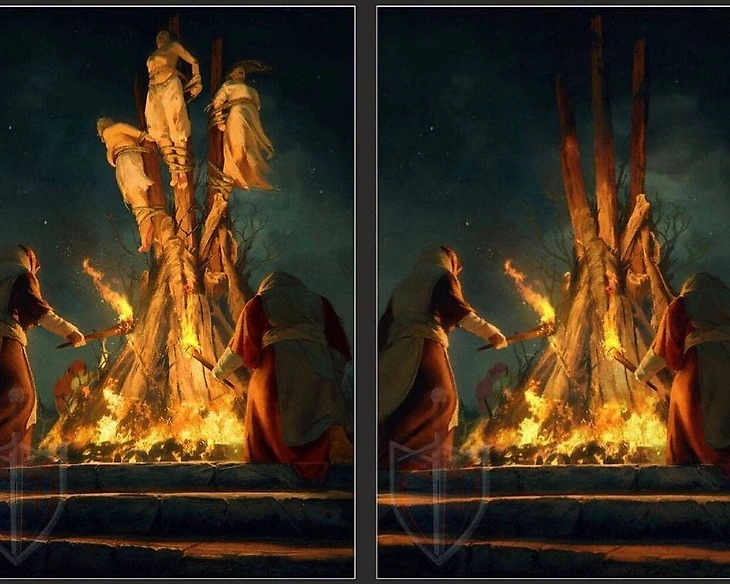 Слева оригинал арта, справа – версия для Китая. Например, Вечный Огонь просто поджигает костер.