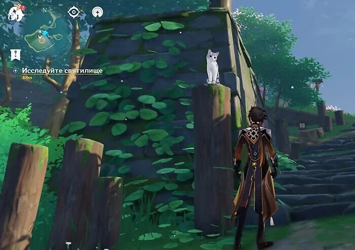 Внутри здания находим черную кошку. Которая разговаривает! Окажется, что она знает секрет Запирающего камня, но просто так не расскажет – нужно починить ящик для пожертвований в этом святилище.