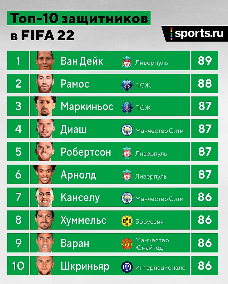 Лучшие защитники FIFA 22: Ван Дейк получил 89, Маркиньос попал в топ-3
