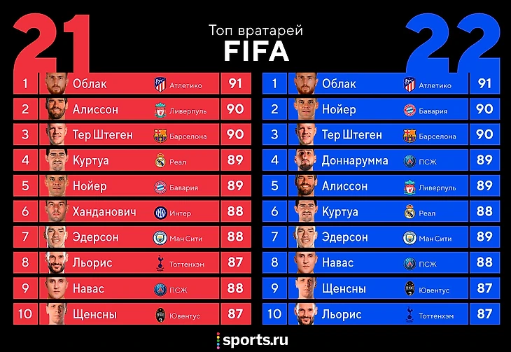 В FIFA 19 лучшим был, кстати, Де Хеа (91), а Облак был третьим (89).