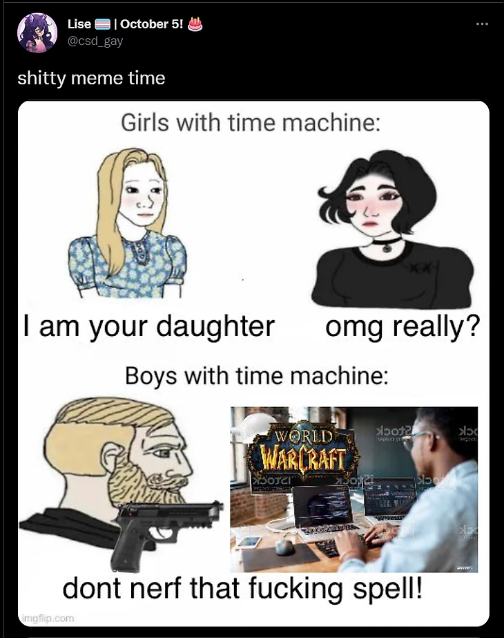 Девушки с машиной времени: «Я твоя дочь» – «Серьезно?». Парни с машиной времени: «Не надо нерфить это чертово заклинание!».