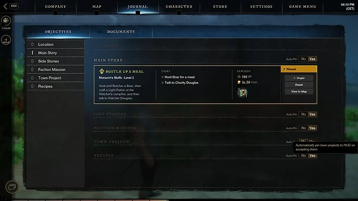 На станциях изготовления предметов можно прикрепить (Pin) рецепты к интерфейсу – собирать ресурсы проще, сверяясь со списком необходимых предметов.