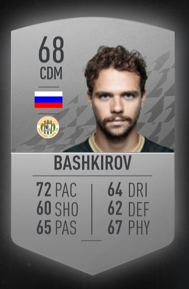Если что, это серебряная карточка Башкирова в Ultimate Team. Не удивляйтесь общему показателю физических способностей (который 67): сверхвыносливость компенсируется низкими статами силы (52), прыжков (55) и агрессии (68).