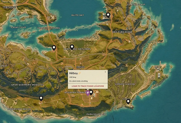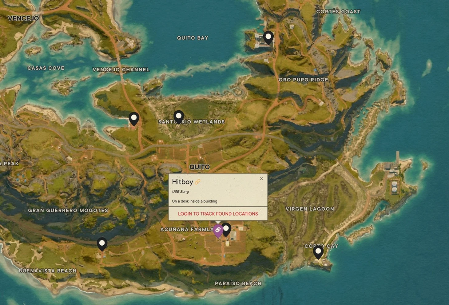 На острове в части Кито можно обнаружить Hitboy. Флешка находится на плантации Вивиро в южной части локации, на карте обозначается – Фермерские угодья Акунана. Когда подойдете в середину этого места, то трек будет располагаться в юго-восточном крытом ангаре на столе.
