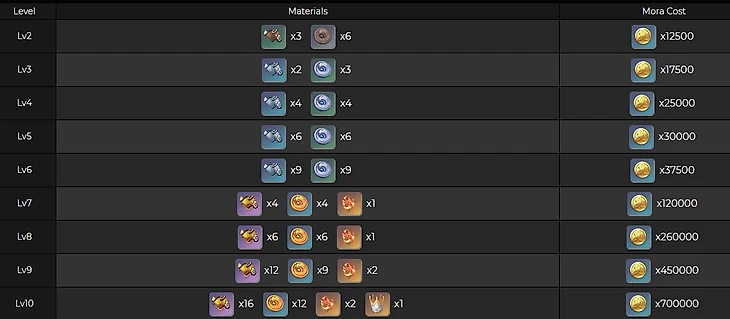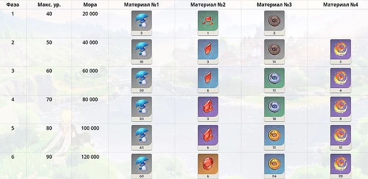 Герой проходит 6 фаз возвышения и для этого потребуется следующее количество материалов: