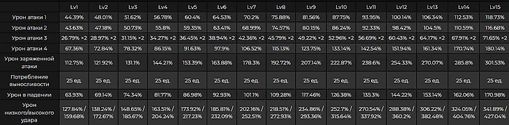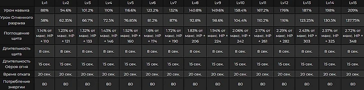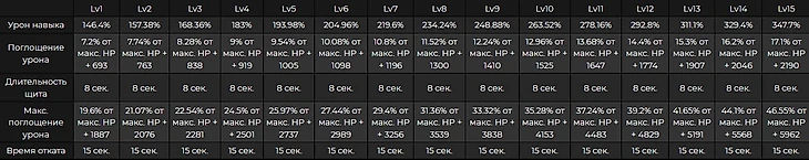 В зависимости от уровня персонажа способность повышает коэффициенты урона и прочности щита.