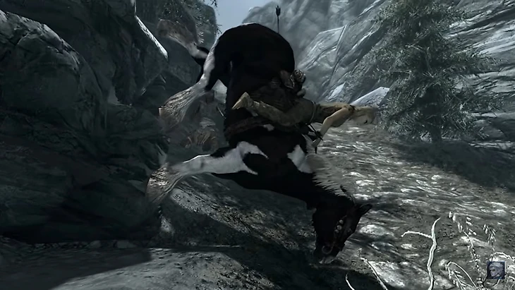 Когда лошадь встанет под нужным углом, нужно сохраниться и слезть с нее. Во время анимации спуска персонажа очень быстро мотает по экрану, подбрасывая как тряпичную куклу. Чем дальше моделька героя будет «летать» от лошади, тем больше скорости она наберет. С этим лучше не перебарщивать – хватит и среднего расстояния. После перезагрузки игра запомнит показатель скорости персонажа и позволит буквально летать по Скайриму.