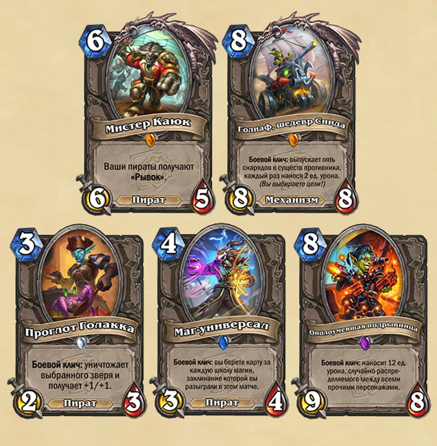 Олды вспомнят старый набор «Гоблинов против гномов», в котором были механизмы и гоблины. Похоже, разработчики вдохновлялись старым сетом при создании нового легендарного «Голиафа» и «Ополоумевшей подрывницы». Три остальных карты связаны с пиратами. Первый кандидат на нерф Мистер Каюк дает всем пиратам рывок, при этом он сам пират, поэтому Воин существенно усилится. А «Проглот Голакка» создан, чтобы контрить Охотников и Друидов, чтобы выживать против них в ранней игре.