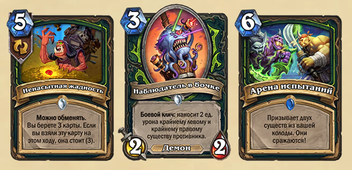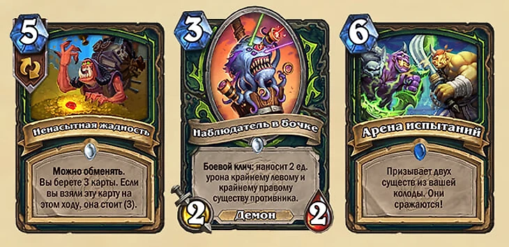 Добор трех карт за три маны – это всегда супер. За пять маны – тоже неплохо, а поменять эту карту с другой в колоде для выполнения квеста – почти идеально. «Ненасытная жадность» точно найдет место в колодах, а вот две другие пока не выглядят настолько сильными, чтобы сразу включать их в существующие архетипы.