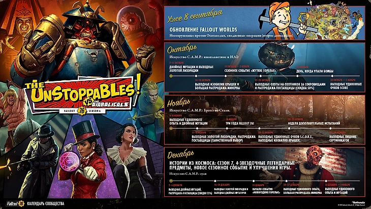 Перед вами дорожная карта Fallout 76 на осень этого года. Впечатляюще, да? Каждый месяц что-то новое, каждая неделя со своим ивентом - сказка! И это действительно сказка. Ты чувствуешь, что об игре не забыли. Ты чувствуешь, что каждый квадратный метр карты и каждый час твоей игры наполнен контентом. Я рад, что разработчики смогли вдохнуть это ощущение насыщенности. Единственная проблема - еженедельные ивенты ограничиваются лишь увеличением заработка той или иной валюты. Но я не думаю, что это плохо. Этого вполне достаточно для такого вида игры