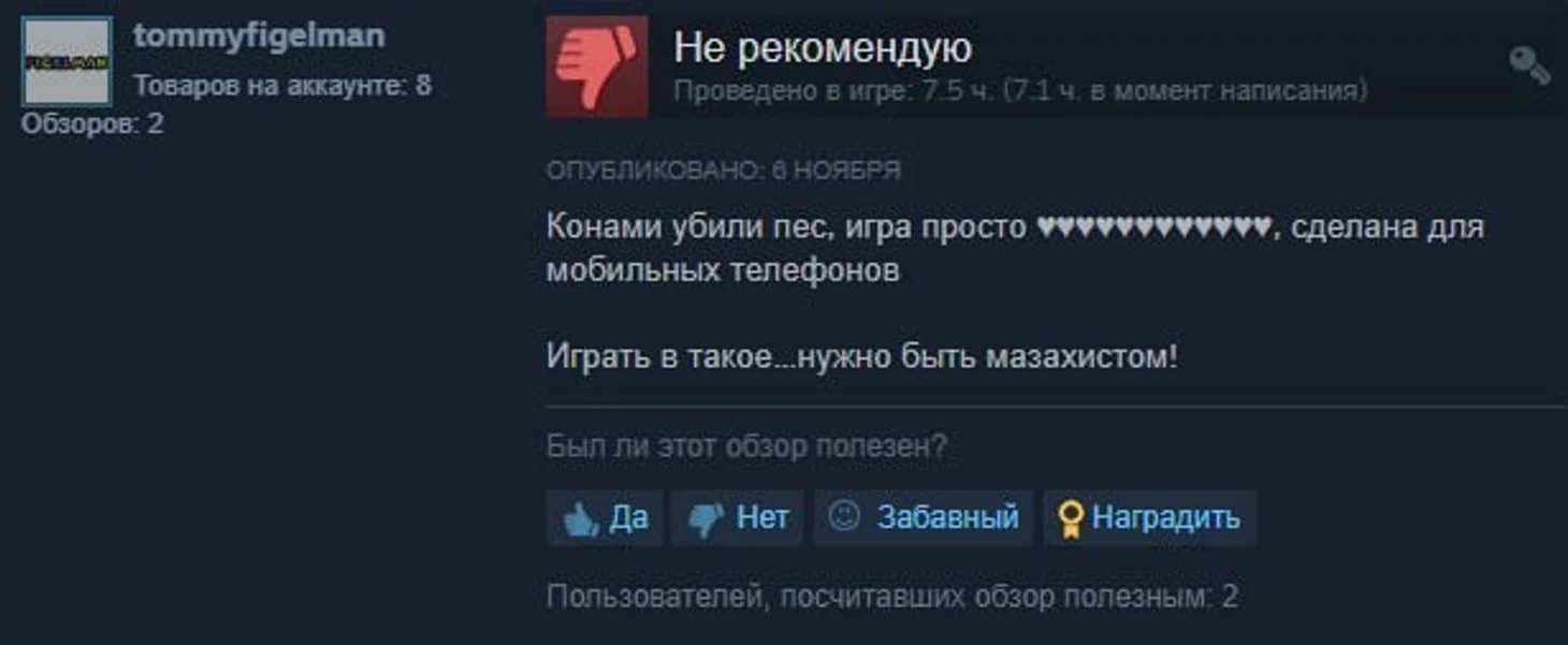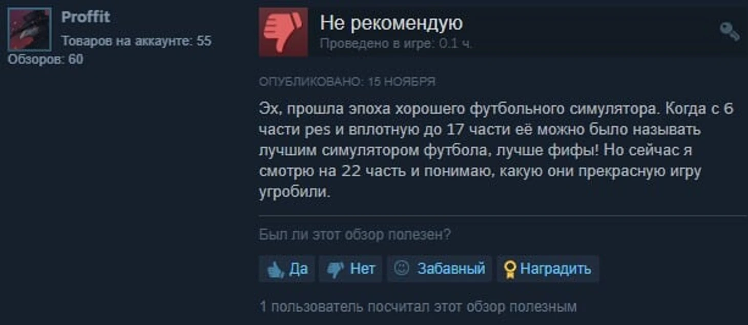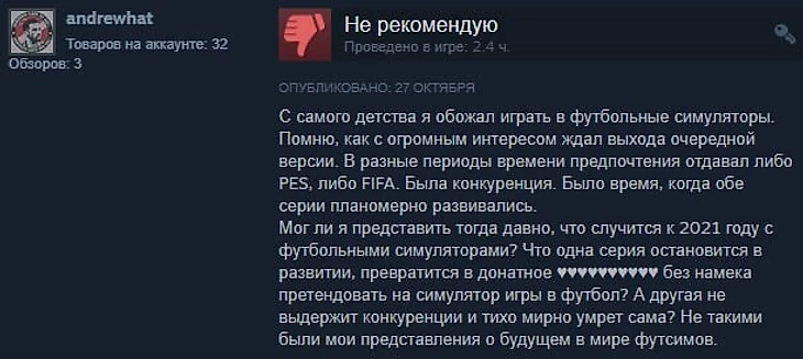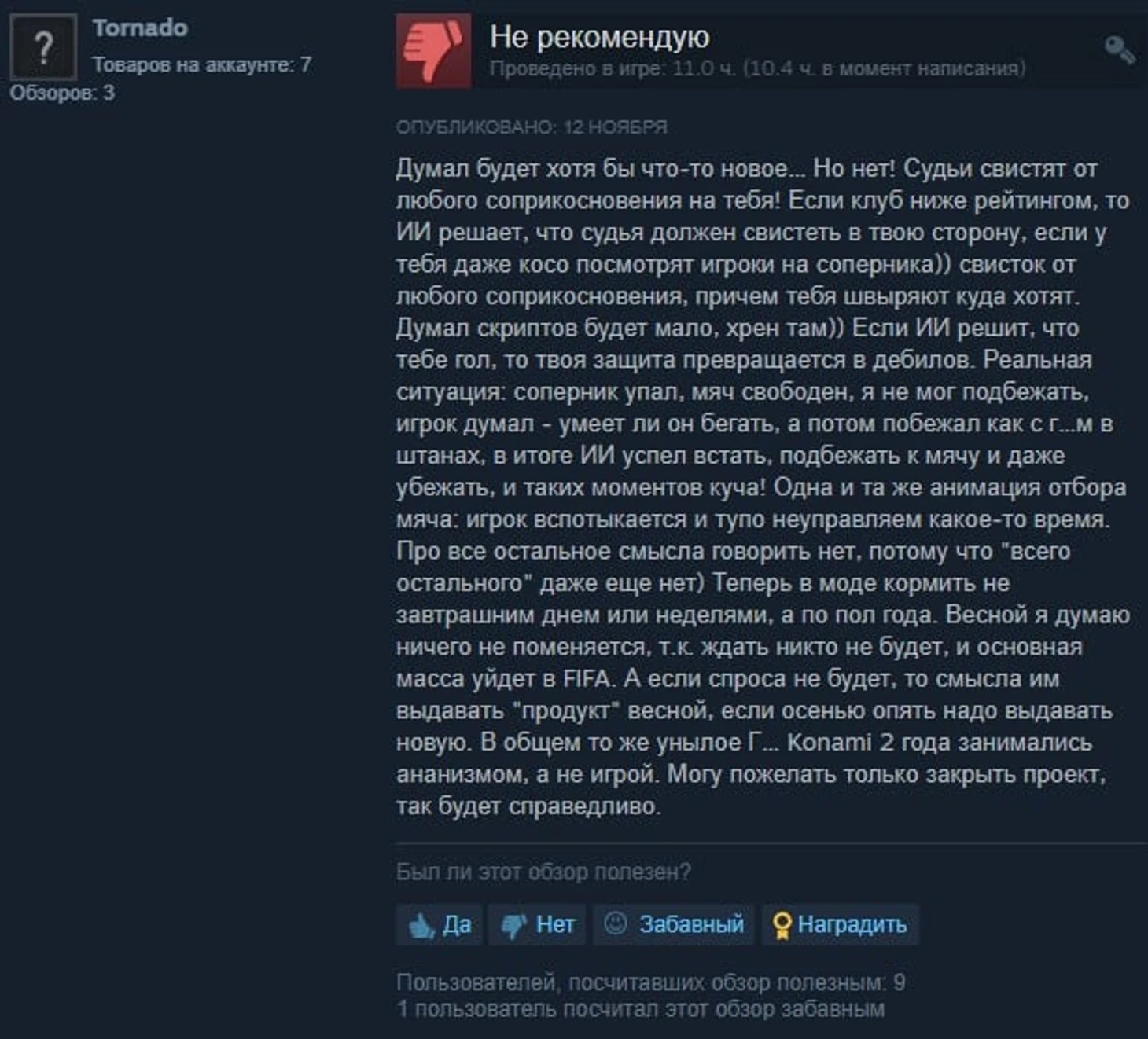 Konami сделала ход конем: чтобы догнать FIFA по продажам, переименовала серию и сделала ее бесплатной. Катастрофой стал выпуск обрезанной версии. «Все выйдет потом: режимы, клубы, улучшения, турниры, исправление кривой мимики и багов. А сейчас будьте добры поиграть девятью клубами» – таким вышел ребрендинг от японцев. Пользователи отреагировали сокрушительным ударом: позорные 12% от 24 тысяч написавших отзыв. Однозначный лидер не только этого года, но и за всю историю Steam.