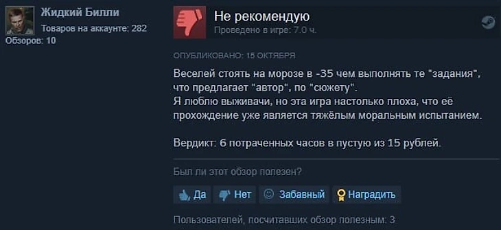 Выживач от турецкого разработчика-одиноки аудитории не понравился: 43% положительных из полутора тысяч отзывов. Сюжет здесь специфический: метеорит упал на заснеженную карту, а герою теперь нужно искать нужные инструменты, чтобы включить электростанцию и вызвать спасателей. Удовольствие спорное, графика и геймплей не увлекают, а кампания длится 5-6 часов. Режим выживания – это практически бесцельное хождение по той же карте, только уже без сюжета, но с кучей багов.