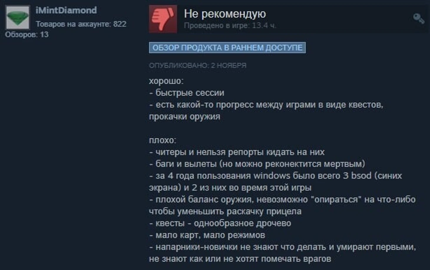 Яркий пример фри-ту-плей шутера, которому не удалось привлечь игроков. Идея неглупая: три команды по три игрока сражаются на карте и выполняют несложные задания вроде захвата точки и уничтожения объекта. Главной проблемой для новых пользователей стала невозможность в нее сыграть: минимальный онлайн, куча багов и вылетов. Впрочем, это не финальная версия продукта, а ранний доступ – но пока у него 44% положительных отзывов.
